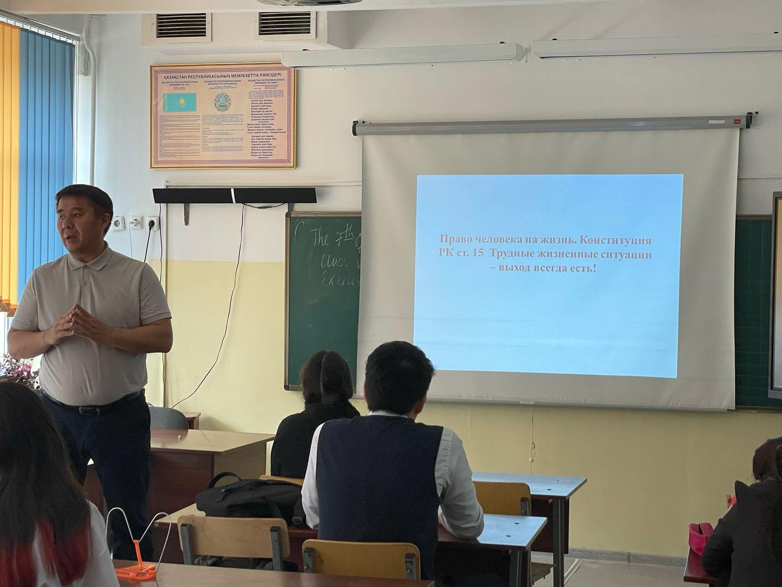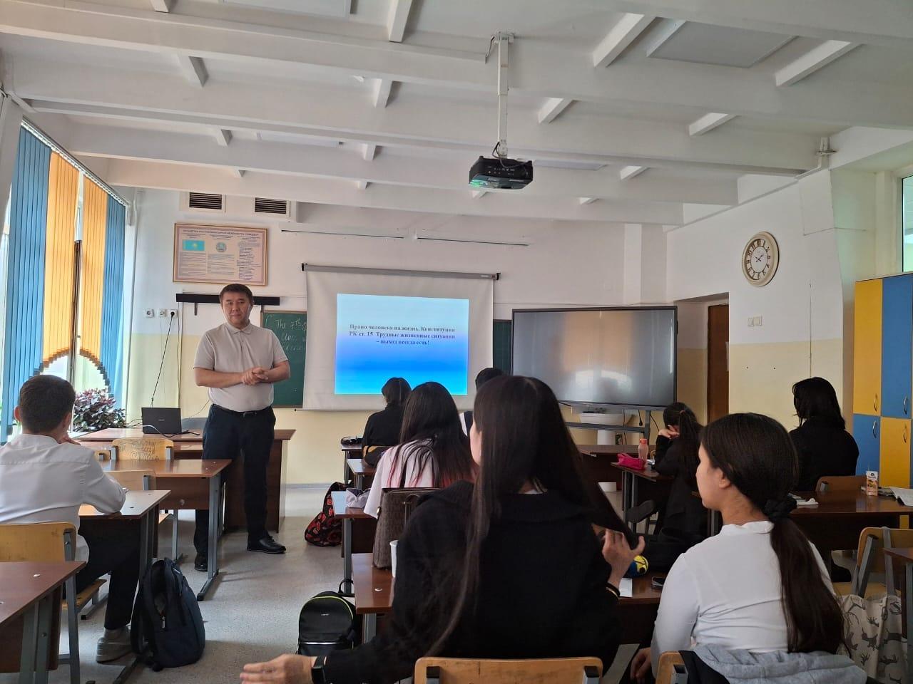 07.04.25 ж. «КӨМЕК» бағдарламасы / Еңбекқорлық және кәсіби біліктілік/ Жалпыға бірдей құқықтық білім беру аясында 10-11 сыныптарға "Адамның өмір сүру құқығы ҚР Конститутциясы, 15 бап. Өмсірде қиын жағдайға тап болғандар - одан шығудың жолы бар" тақырыбында сынып сабақтары өткізілді.
