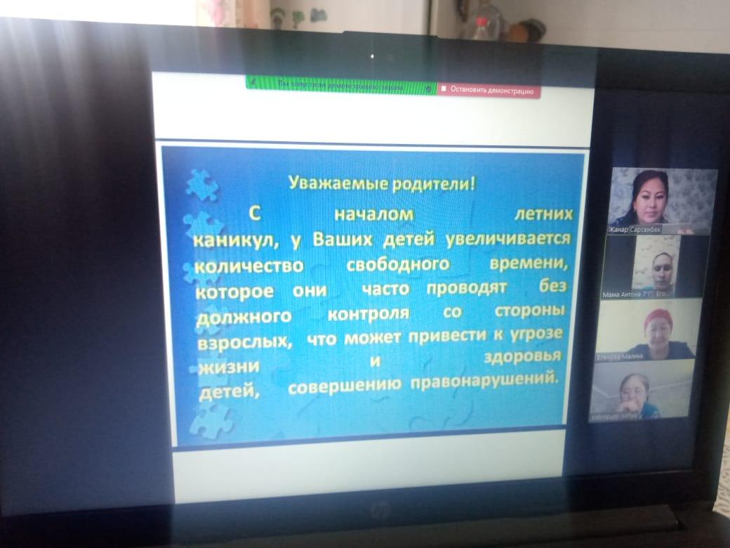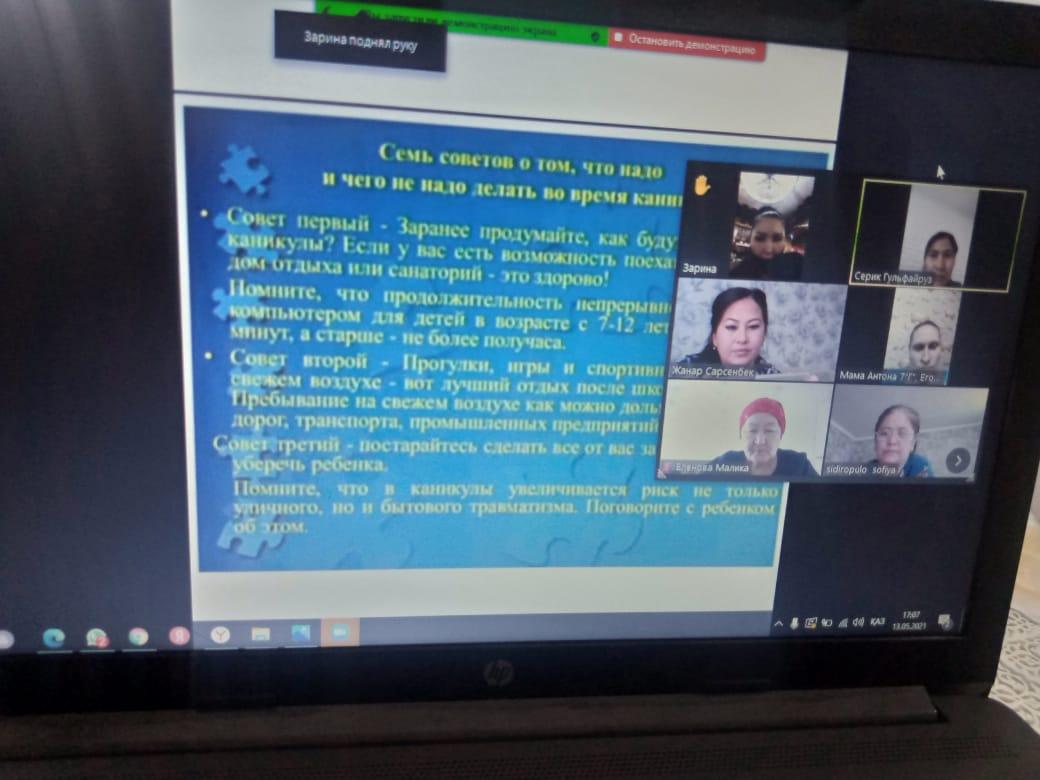 13 май 2021 0 1 2 3 4 5 Родительское собрание прошло в КГУ ОШ № 98 на тему:" Безопасность детей на летних каникулах"