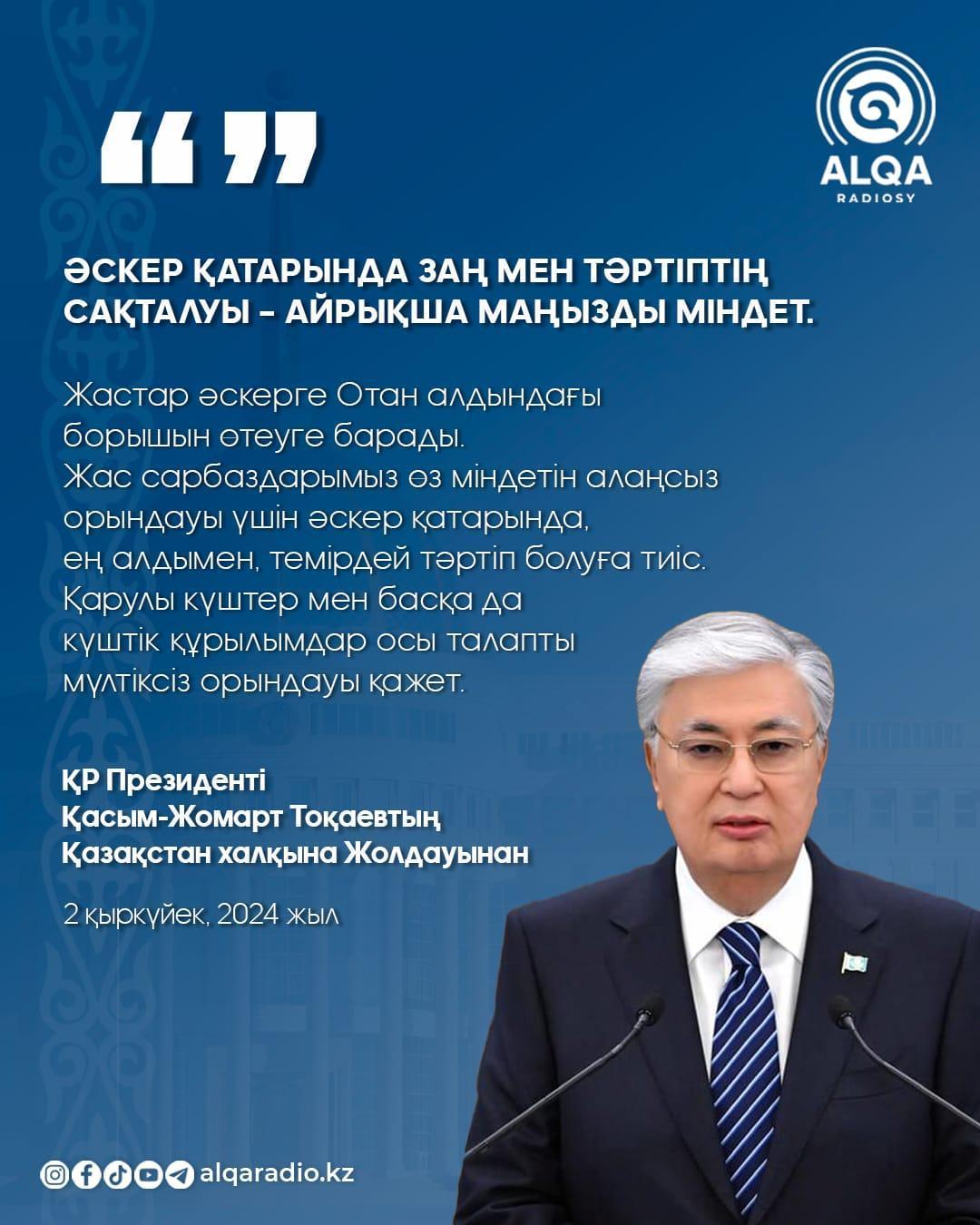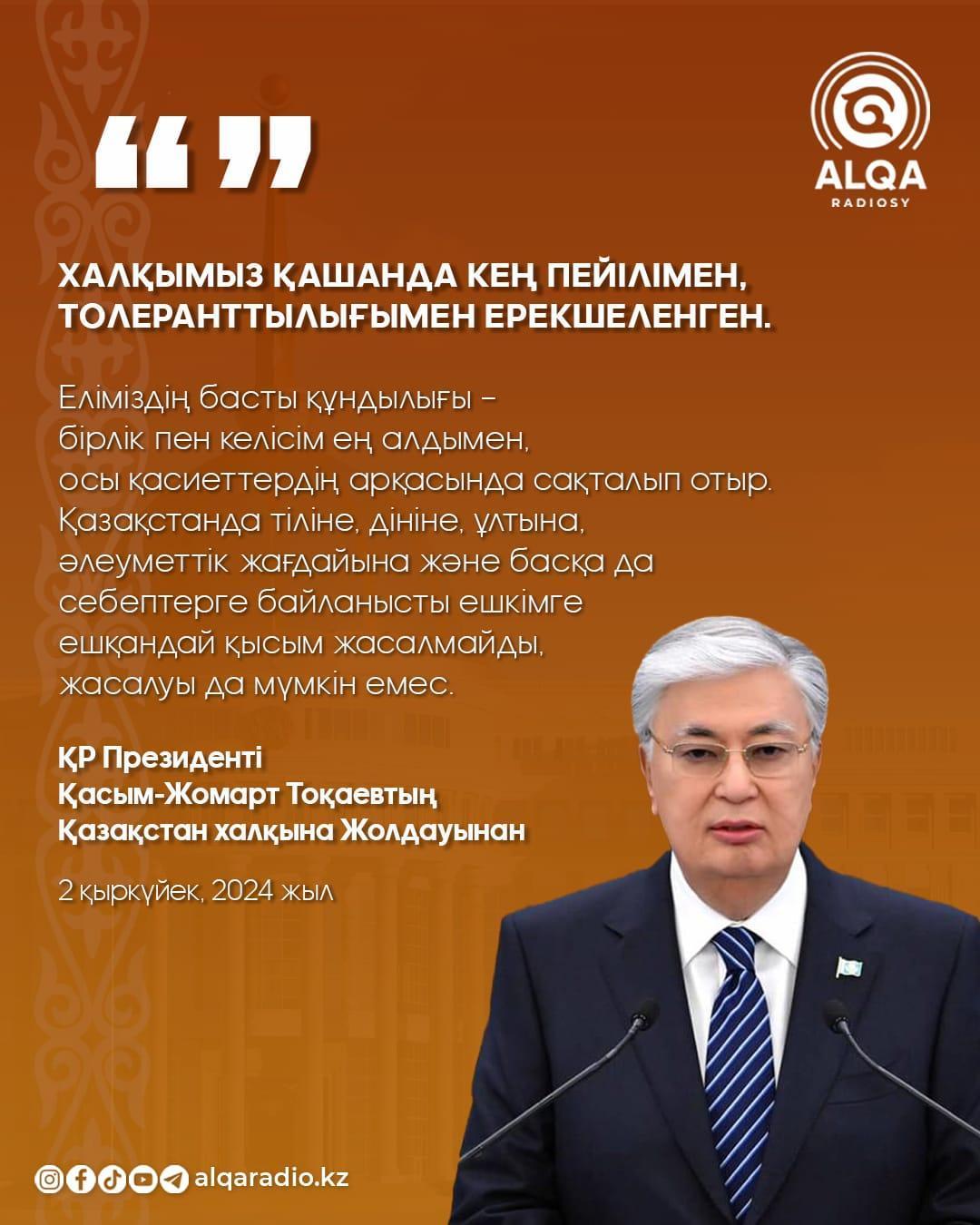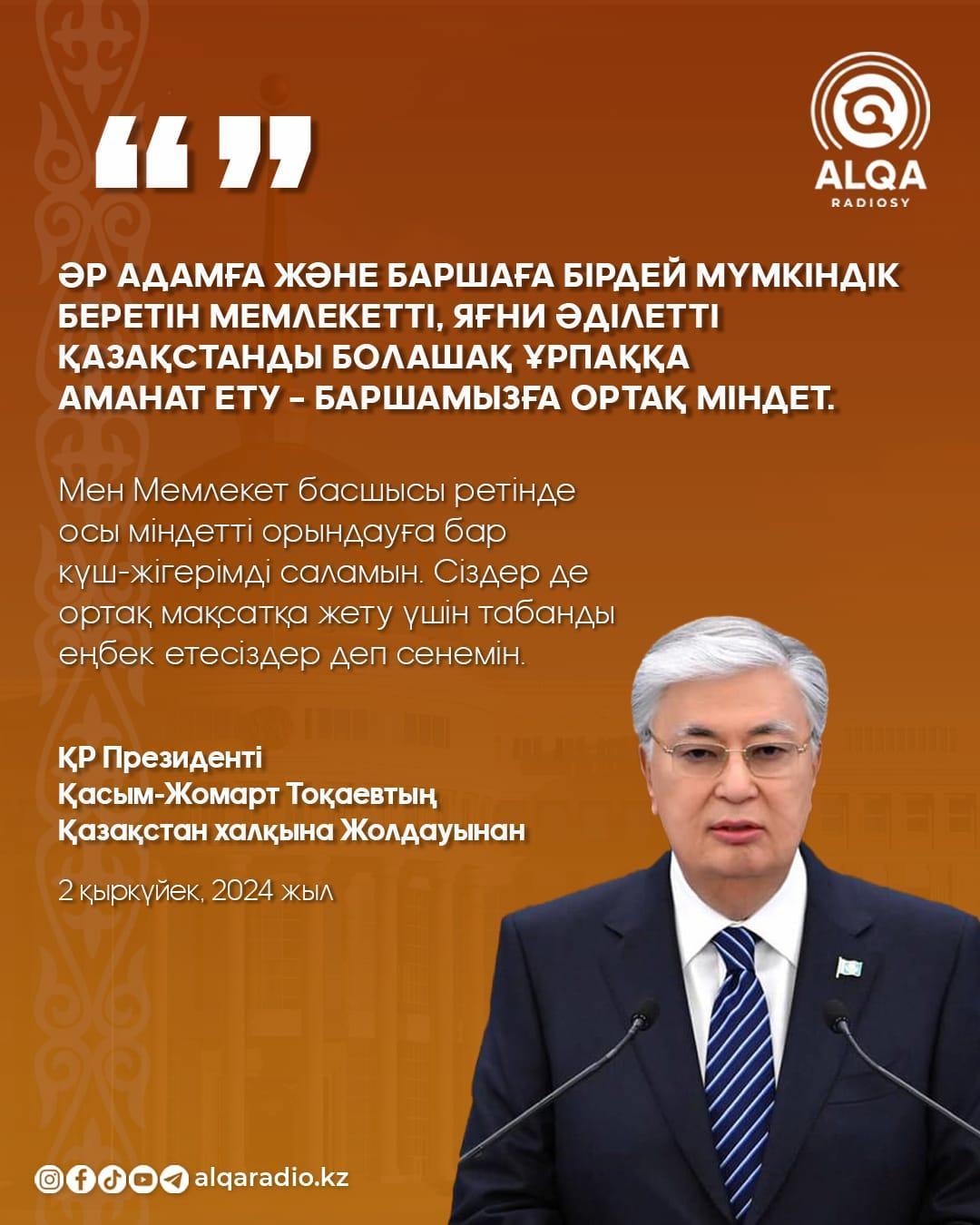 Мы должны решать стоящие перед нами задачи прагматично и последовательно, не впадая в пессимизм и апатию. От этого зависит не только благополучие народа, но и историческая судьба страны в эту непростую эпоху. У нас есть четкое видение долгосрочных перспектив развития нашего государства. Для достижения поставленных высоких целей нам необходимо сохранять сплоченность, проявлять взаимную поддержку и уважение. Благодаря единству наш народ всегда достойно преодолевал различные вызовы. Так будет и впредь. Давайте вместе сделаем нашу Родину справедливым и развитым государством, в котором каждый может найти свое призвание и претворить мечты в реальность. У нас общая высокая миссия – построить для будущих поколений Справедливый Казахстан, государство равных возможностей для всех и каждого. Для этого как Глава государства я приложу все усилия. Уверен, и вы будете неустанно трудиться во имя общей цели.