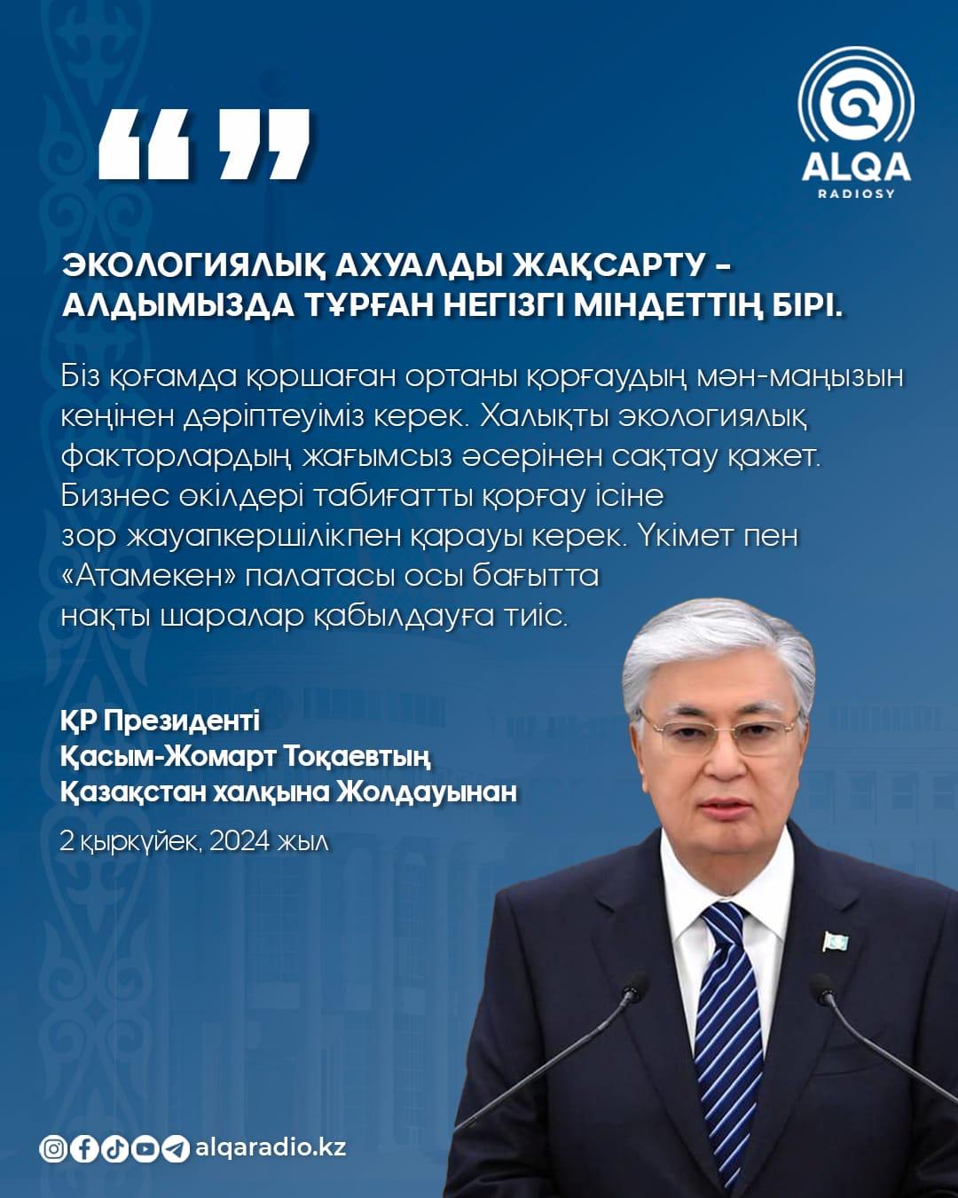 Надо, чтобы жители нашей страны были защищены от влияния негативных экологических факторов. Бизнес должен с большой ответственностью подходить к делу защиты природы. Правительству и палате «Атамекен» следует принять конкретные меры. Нужно продолжить широкое внедрение самых передовых технологий в эту сферу, а также наладить работу современной системы мониторинга эмиссий. В фокусе нашего внимания останутся вопросы сохранения уникальной флоры и фауны Казахстана. Государство предпримет все необходимые меры для защиты лесов и степей от пожаров. Несмотря на огромное природное разнообразие Казахстана, леса занимают лишь 5% территории страны. Воспроизводство лесов имеет определяющее значение для сохранения экологического равновесия и дальнейшего устойчивого социально-экономического прогресса страны. С первых дней своего президентства я уделяю особое внимание этому вопросу. В стране набраны неплохие темпы озеленения, которые нельзя снижать. В лесном резервате «Семей орманы» функционирует единственный в Центральной Азии лесосеменной комплекс по выращиванию посадочного материала, соответствующий передовым международным стандартам. Необходимо масштабировать данный проект в других лесных регионах республики. Идея увеличения лесных массивов должна стать по-настоящему народной. По этой теме нужно организовать серьезную информационно-разъяснительную работу среди граждан.
