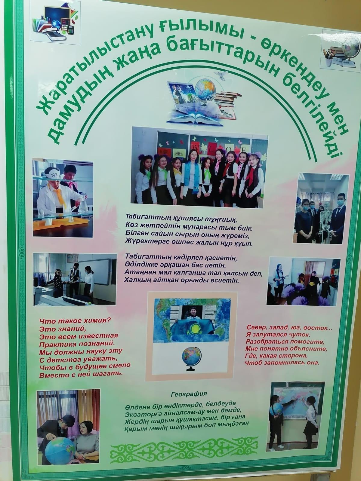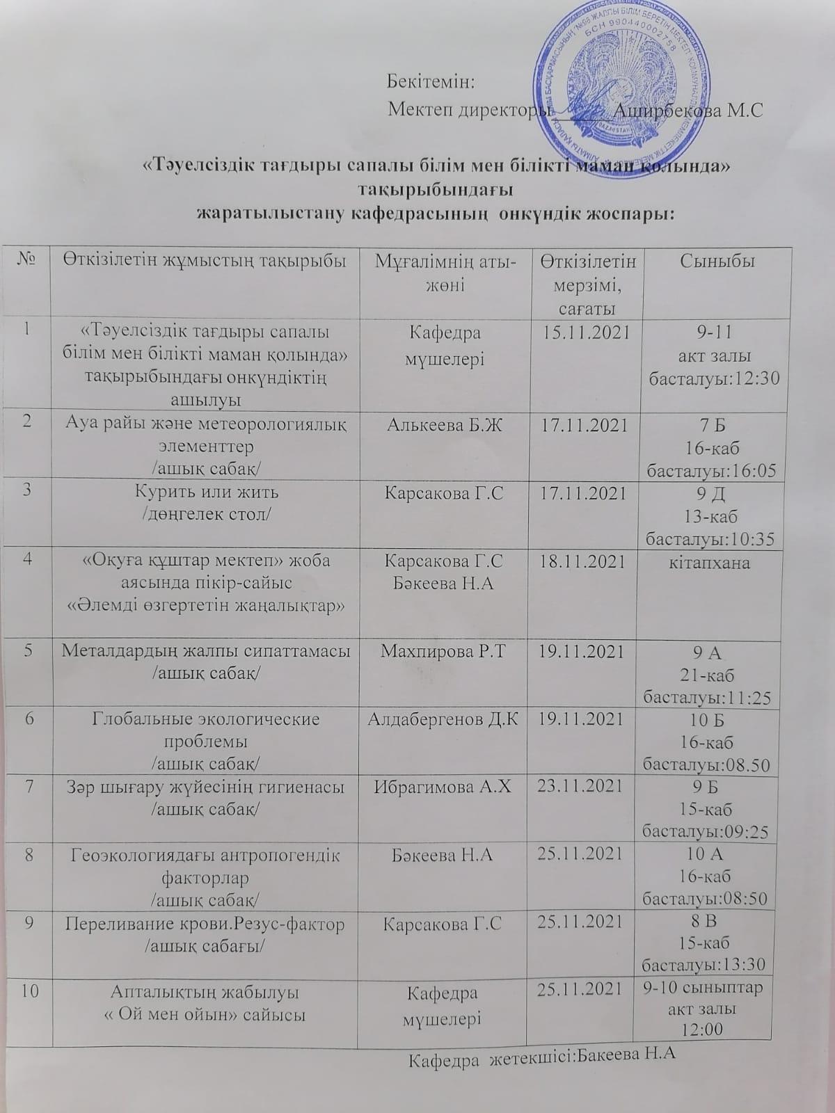 ОШ №98 » Іс-шаралар » "Тәуелсіздік тағдыры сапалы білім мен білікті маман қолында" тақырыбындағы жаратылыстану кафедрасының онкүндік жоспары.