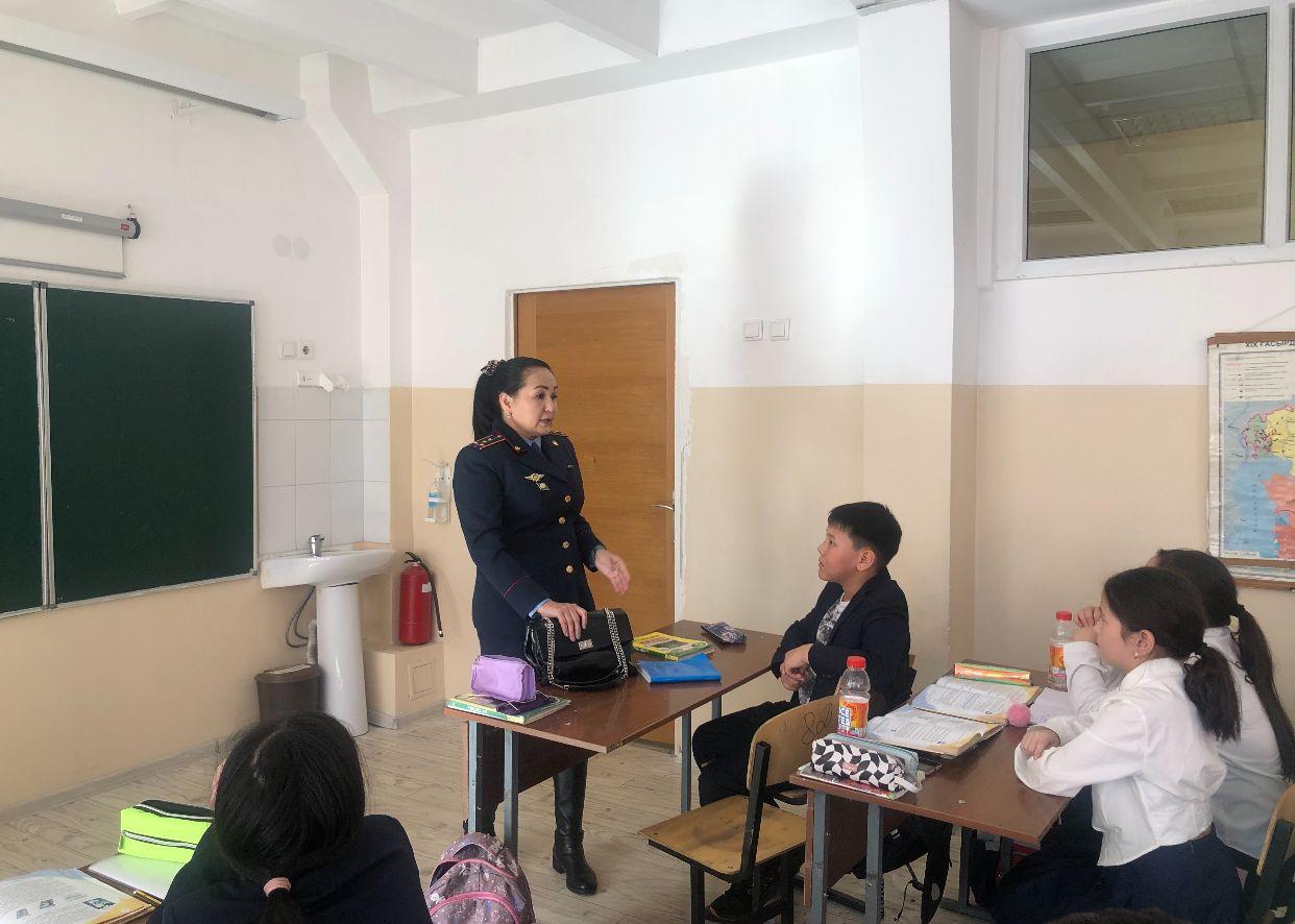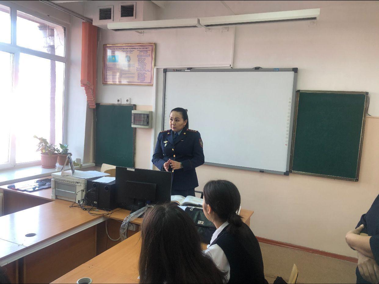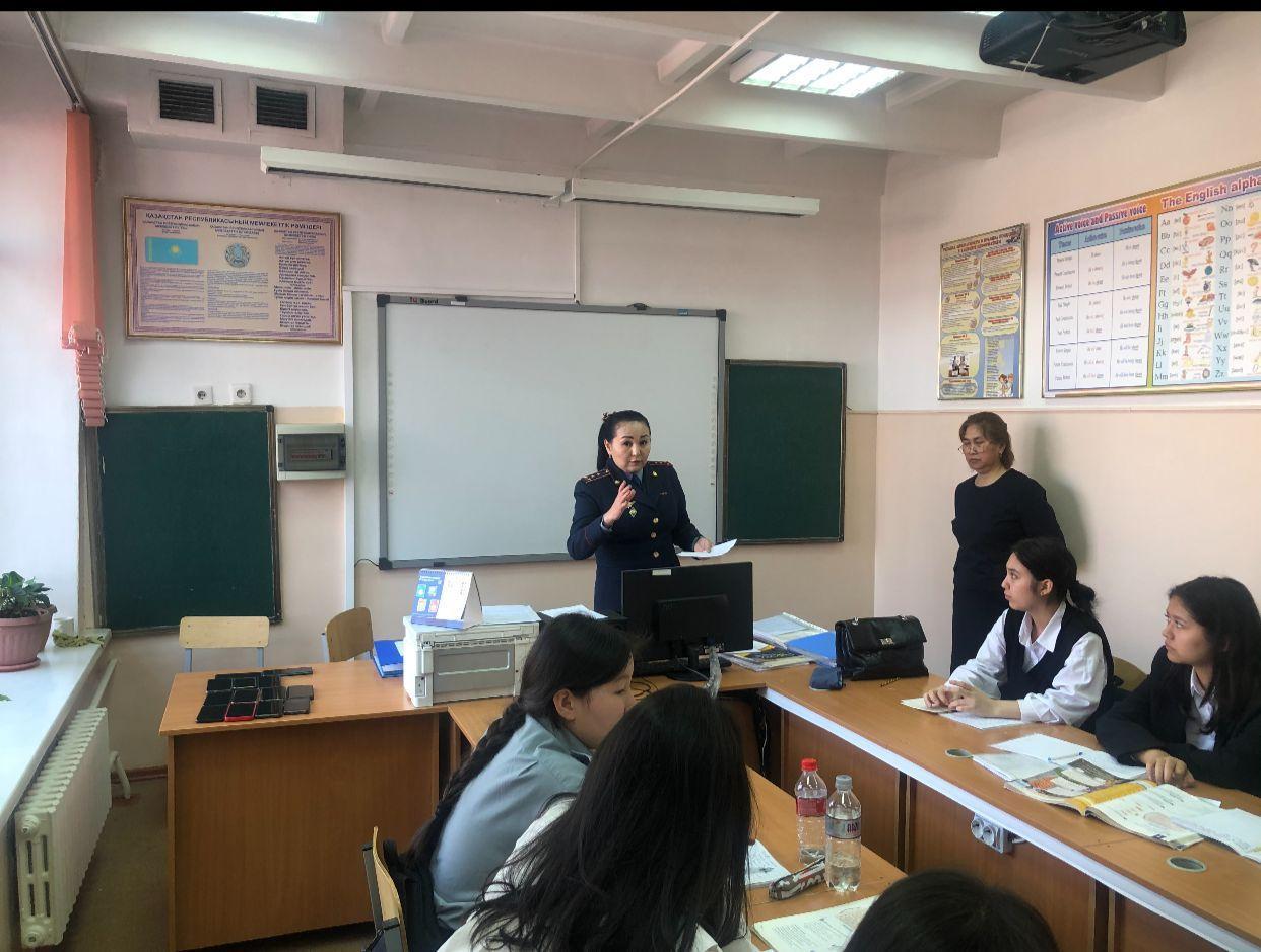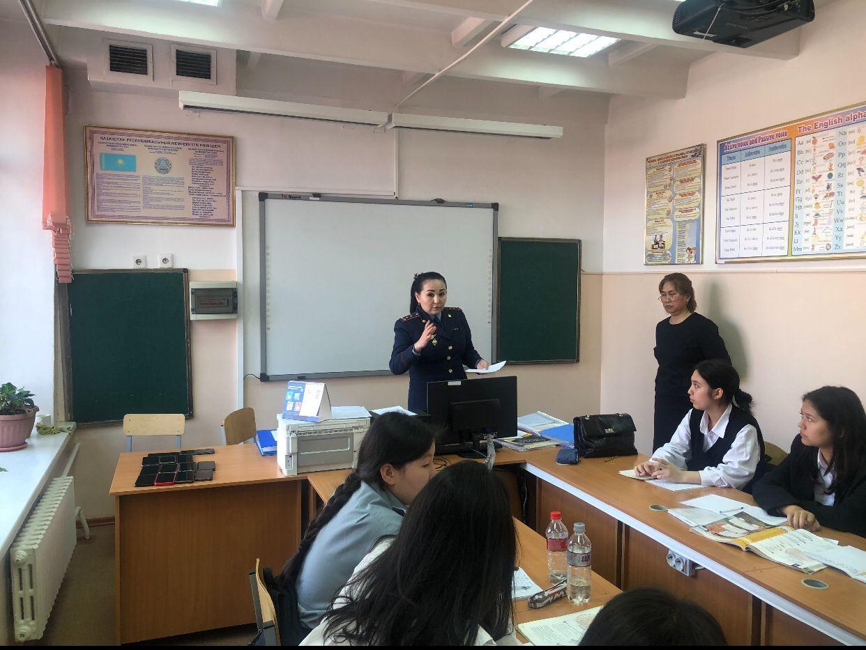Құқықбұзушылықтың аллын-алу туралы мектеп оқушыларымен әңгіме жүргізуде