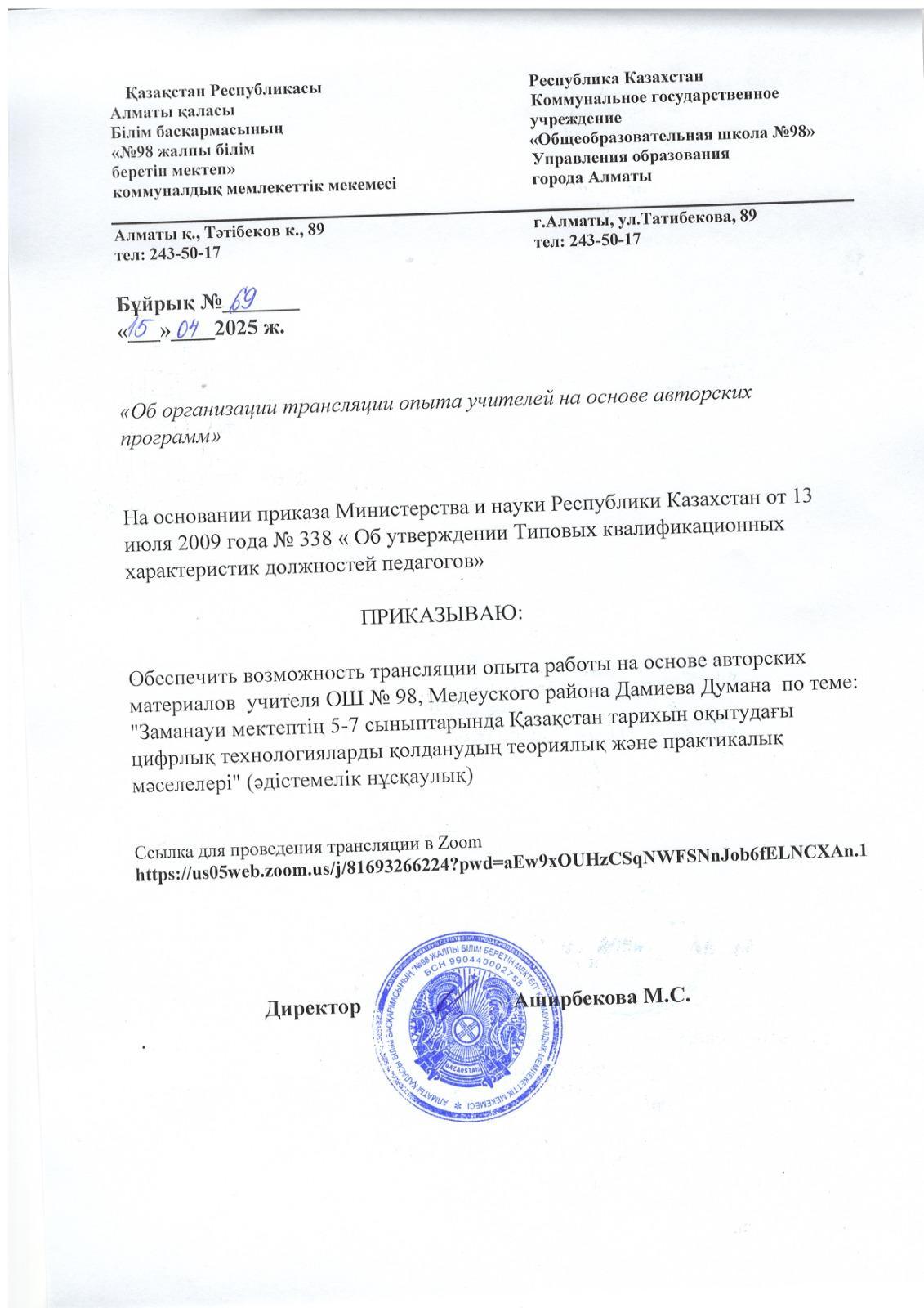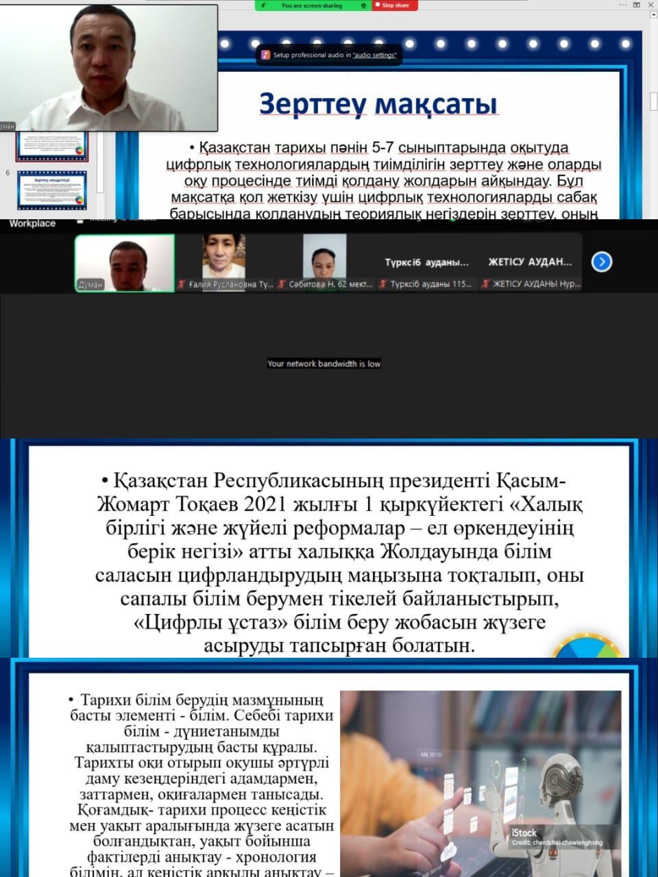 15.04.2025 ж мектебіміздің тарих пәні мұғалімі Дамиев Думан "Заманауи мектептің 5-7 сыныптарында Қазақстан тарихын оқытудағы цифрлық технологияларды қолданудың теориялық және практикалық мәселелері" тақырыбында вебинар өткізді! Тақырып қызықты, әрі заман талабына сай болғандықтан қатысушы әріптестердің көңілінен шығып, белсенділік танытты.