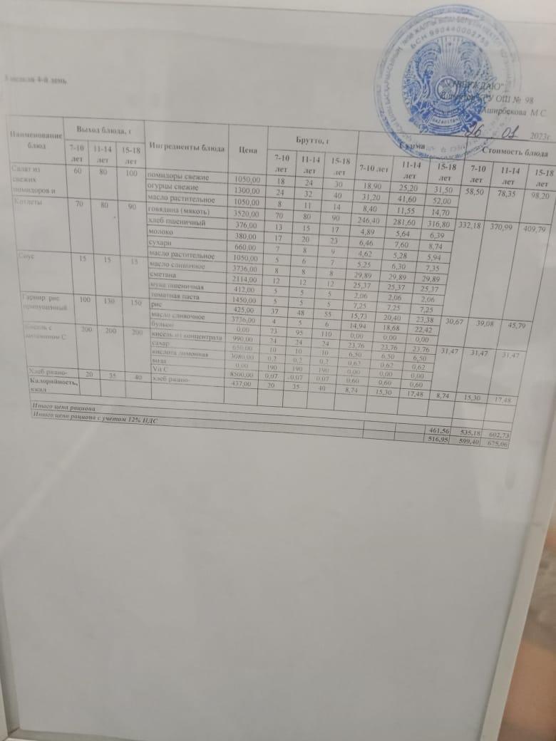 1 апта 4-ші күннің ас мәзірі
