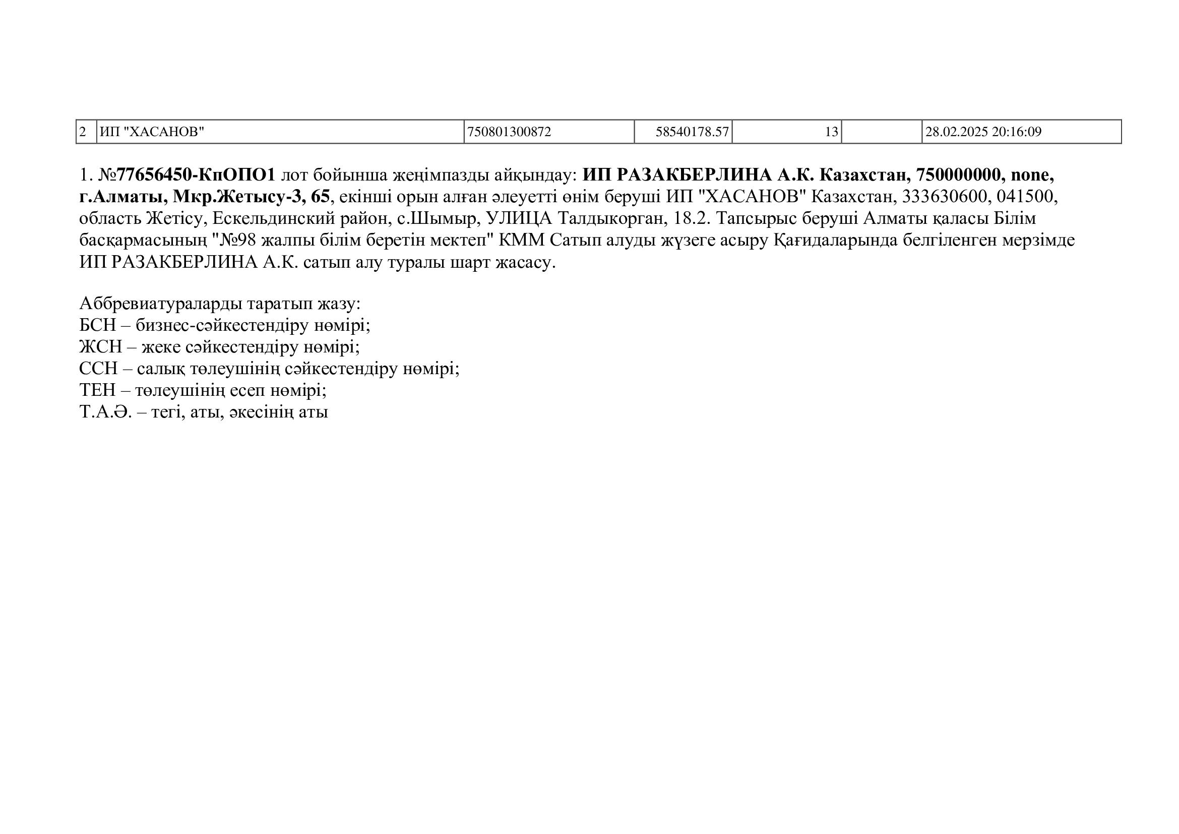 Мемлекеттік сатып алу байқауына қатысу бойынша нәтижесінің хаттамасы