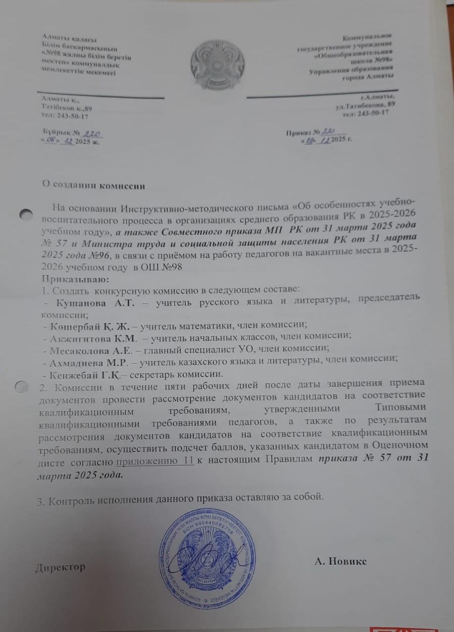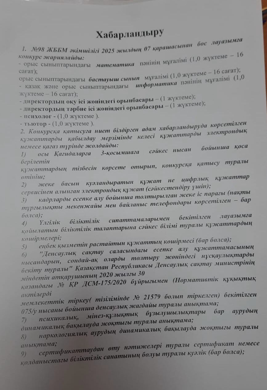 №98 ЖББМ 2025 жылдың 07 қарашасынан бос лауазымға конкурс жариялауы
