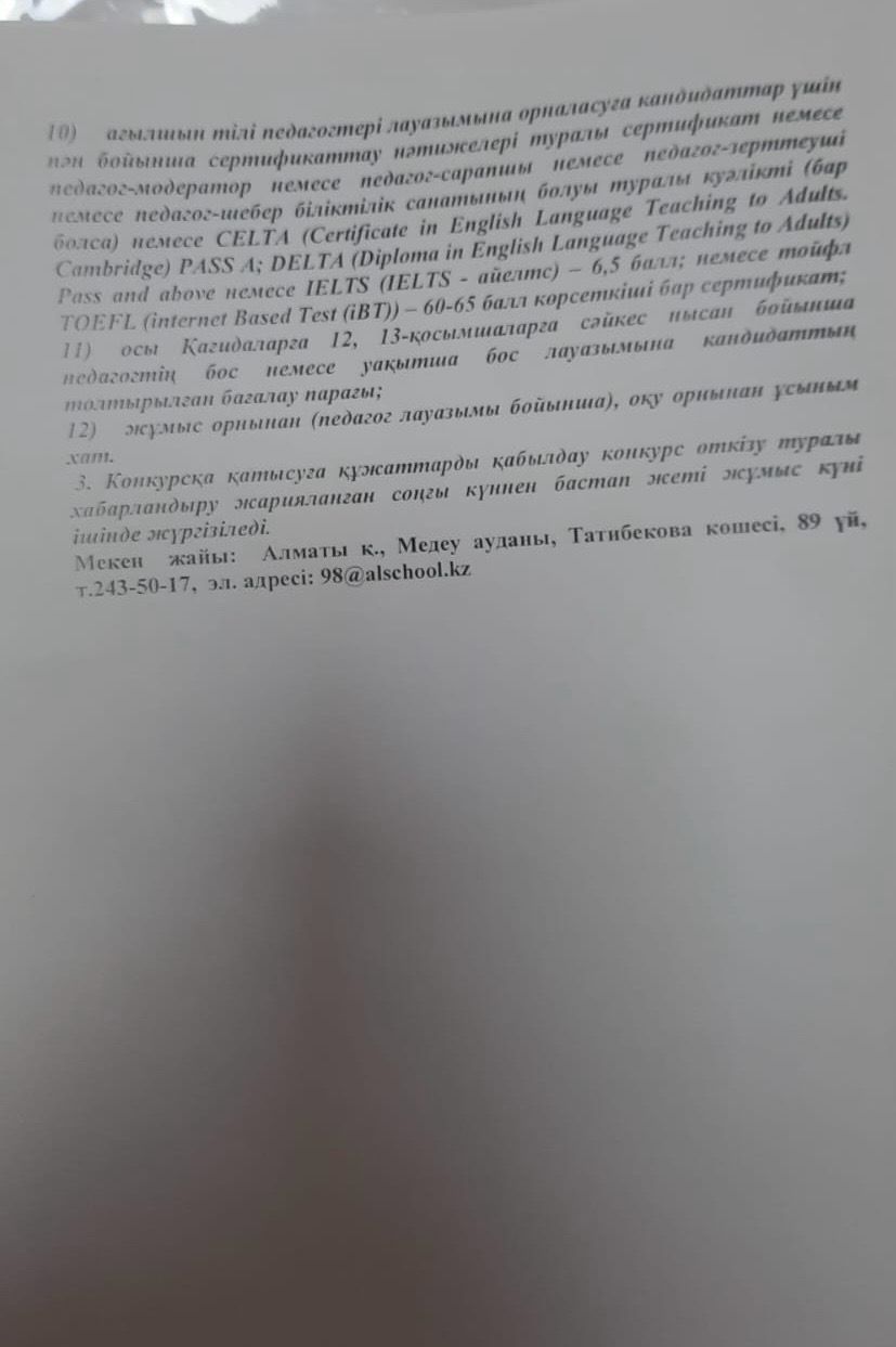 №98 ЖББМ әкімшілігі бос лауазымға конкурс жариялайды.Администрация ОШ №98 объявляет на вакантные места.