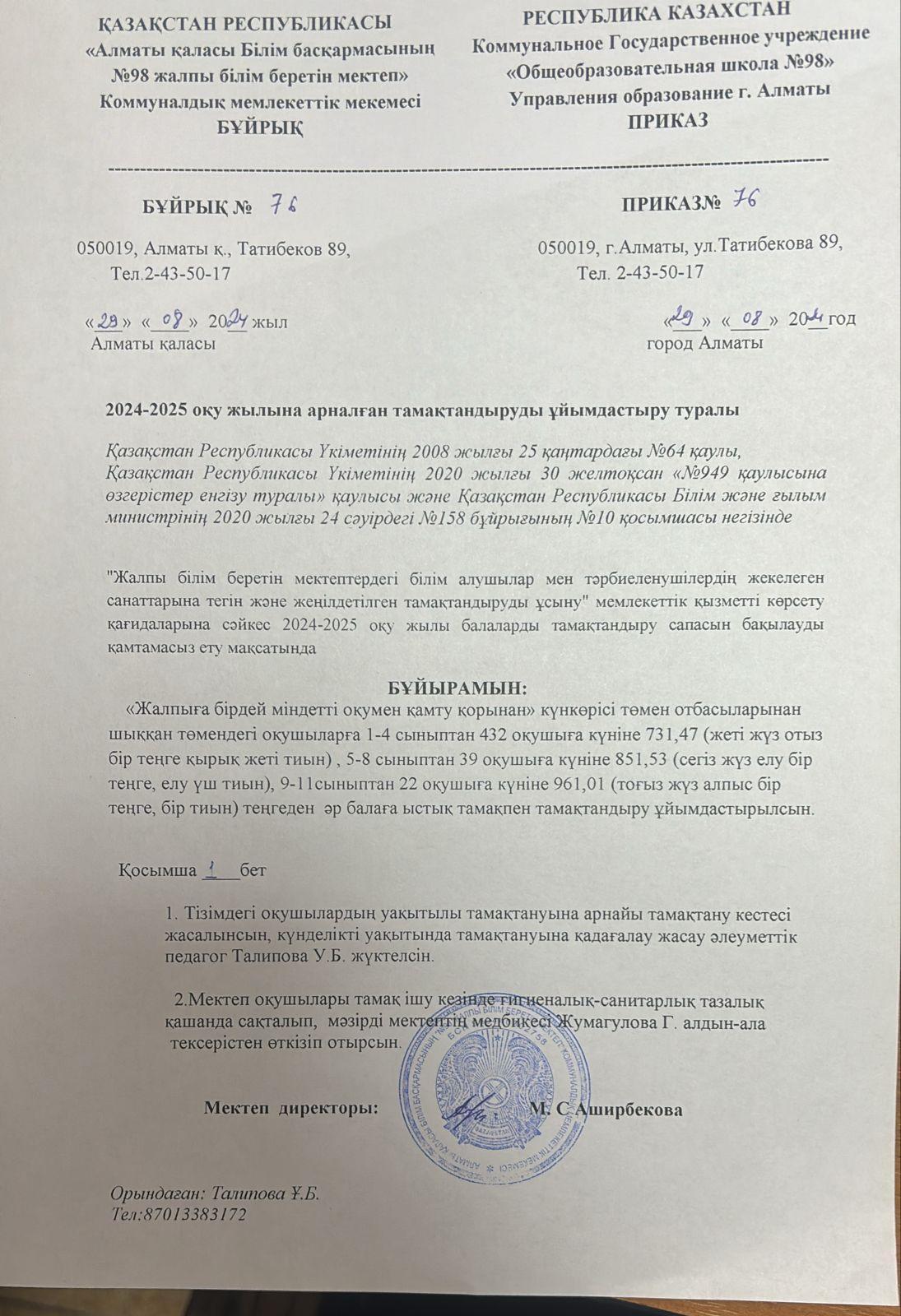 Бұйрық №77.2023-2024 оқу жылына арналған тамақтандыру ұйымдастыру туралы.