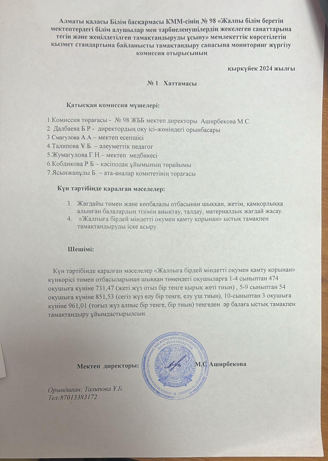 Тегін және жеңілдетілген тамақтандыруды. №1 Хаттамасы